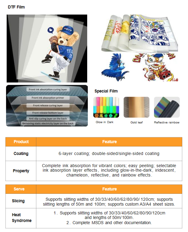 This DTF film adopts a 6‑layer coating structure for full ink absorption and vibrant color output. It supports glow‑in‑the‑dark, gold leaf, reflective, chameleon and other special effects. It can be slit into multiple widths and lengths, providing stable and high‑quality transfer for professional DTF printing.