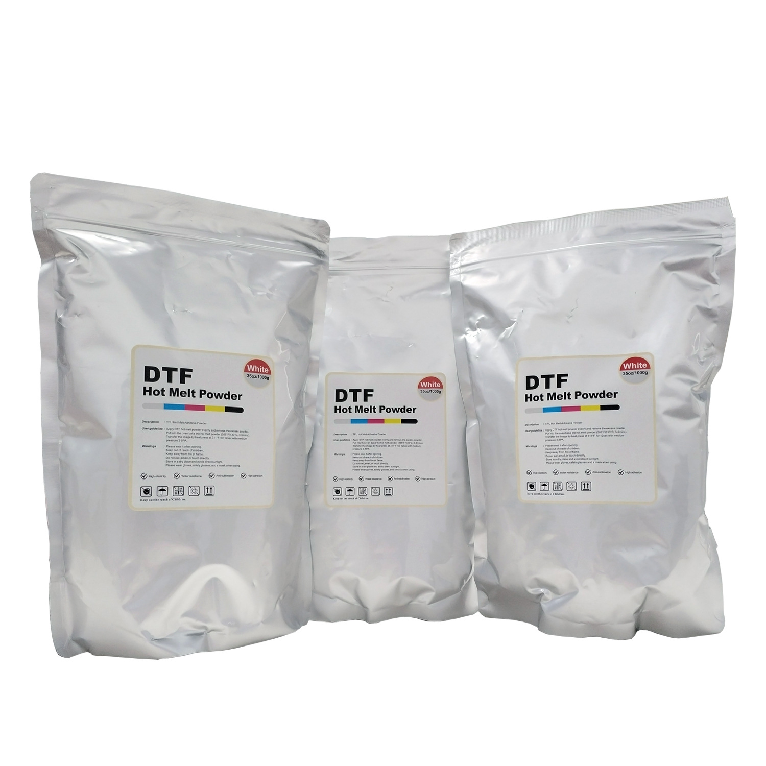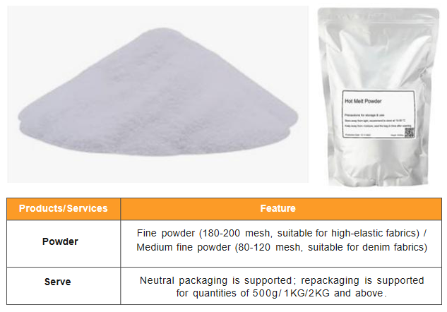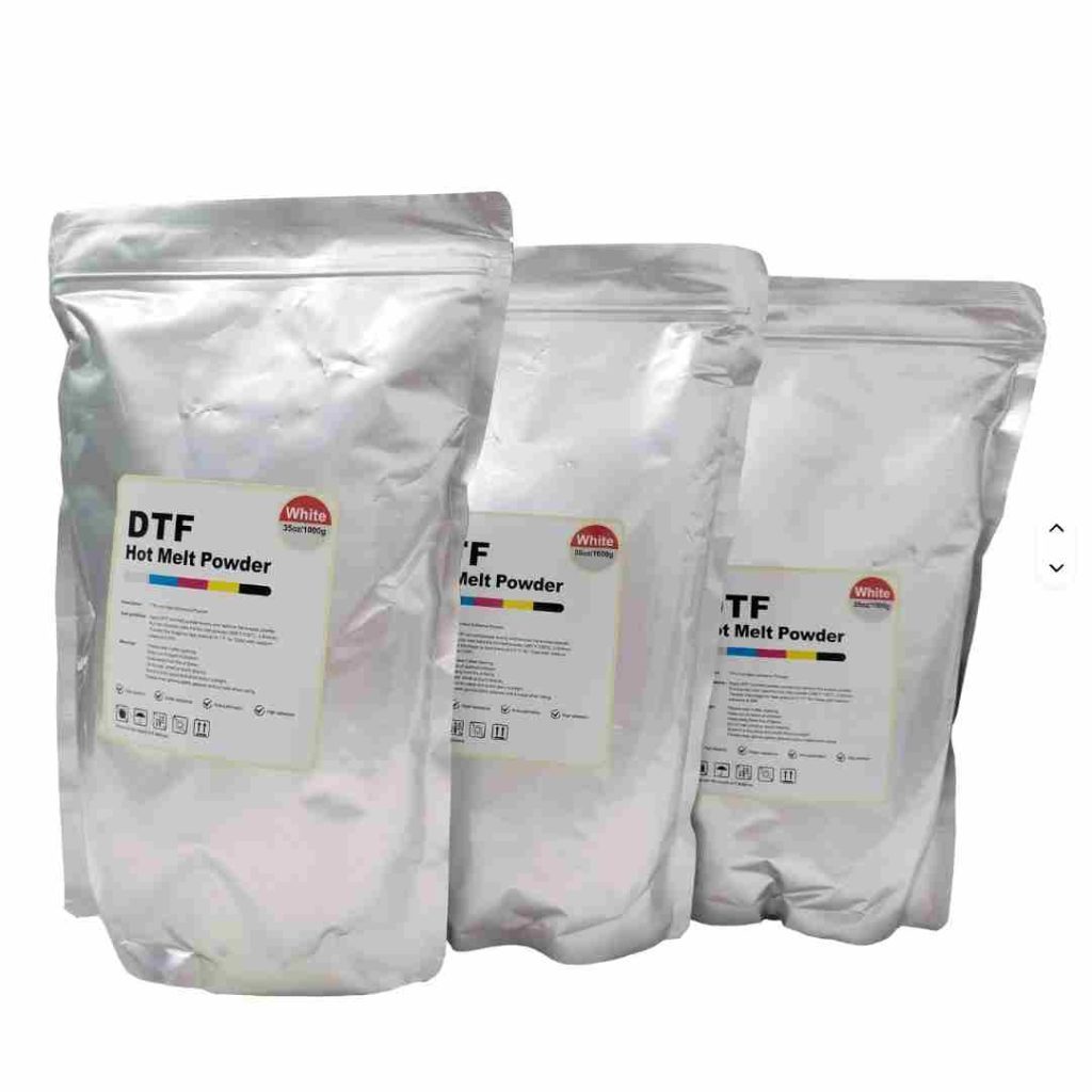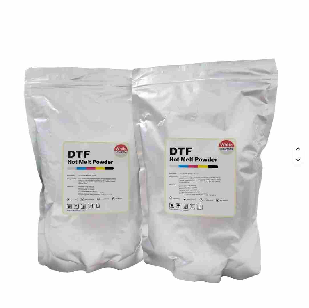 This DTF hot‑melt adhesive powder includes fine (180‑200 mesh) and medium‑fine (80‑120 mesh) types for elastic fabrics and denim. It provides strong bonding, soft hand feel and high wash resistance. It supports neutral packaging and repacking, matching various DTF printing and transfer production demands.