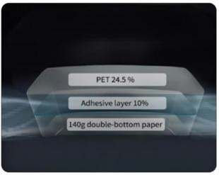 | Product structure | 24.5% PET + 10% German adhesive label + 65.5% 140g double back cover paper |