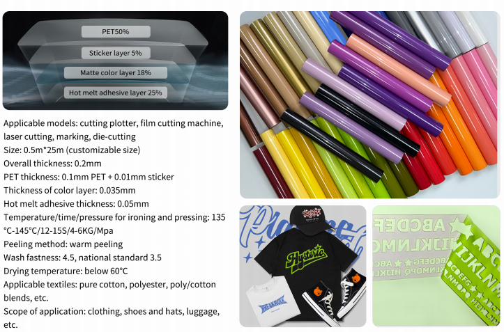 This standard PU heat transfer vinyl features soft hand feel, good elasticity and wash resistance up to 4.5 grades. It supports cutting, laser and die‑cutting machines with easy weeding and warm peeling. Suitable for cotton, polyester and blended fabrics, it is widely used for clothing, hats, bags and fashion decorations, delivering durable, comfortable and clear patterns.