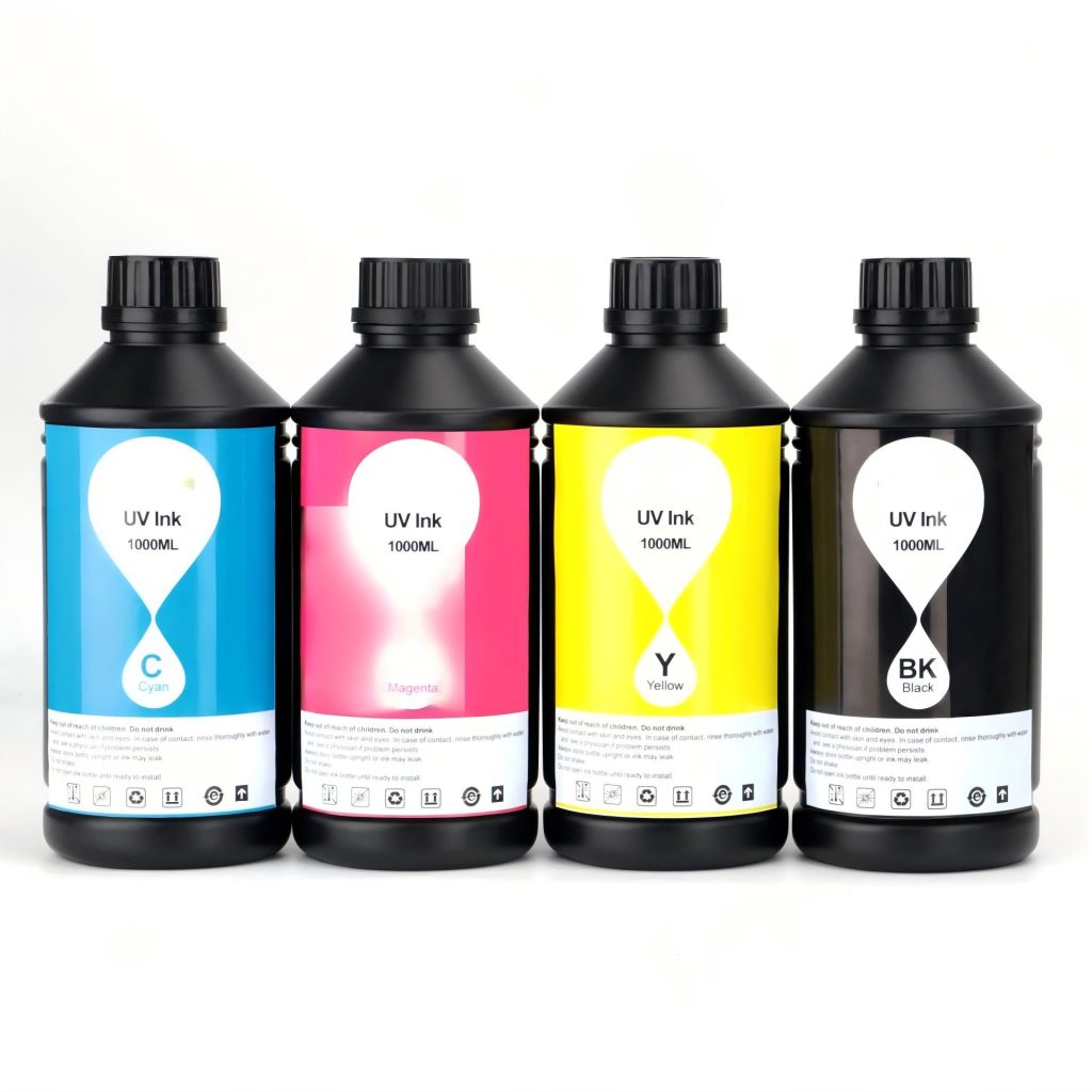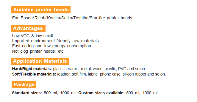 This UV curable ink uses imported eco‑friendly raw materials with low VOC and low odor. It cures fast, saves energy and does not clog print heads. Compatible with Epson, Ricoh, Konica and other heads, it works on glass, ceramic, metal, leather, soft film and various rigid or flexible materials for stable and clear printing.